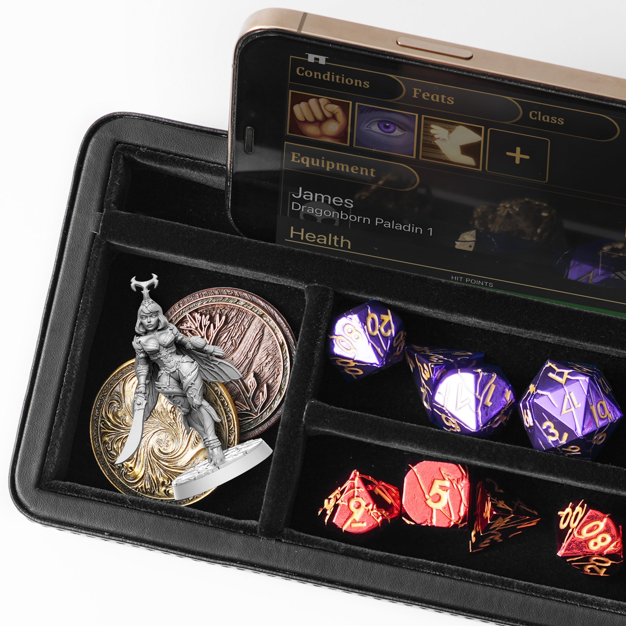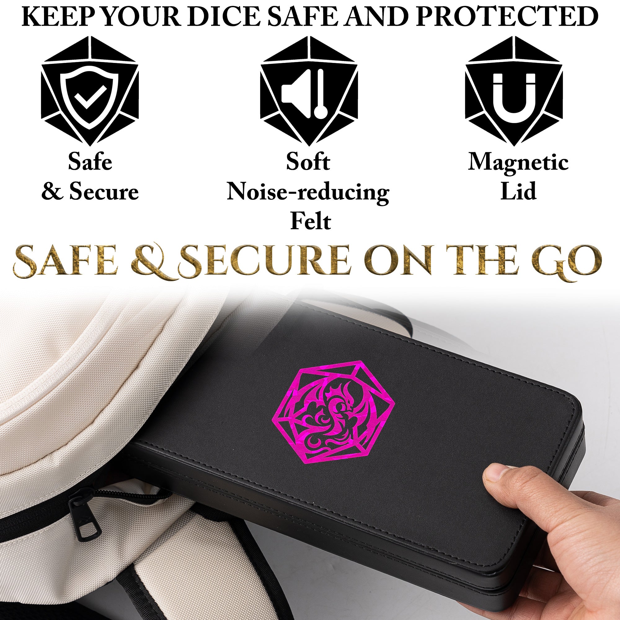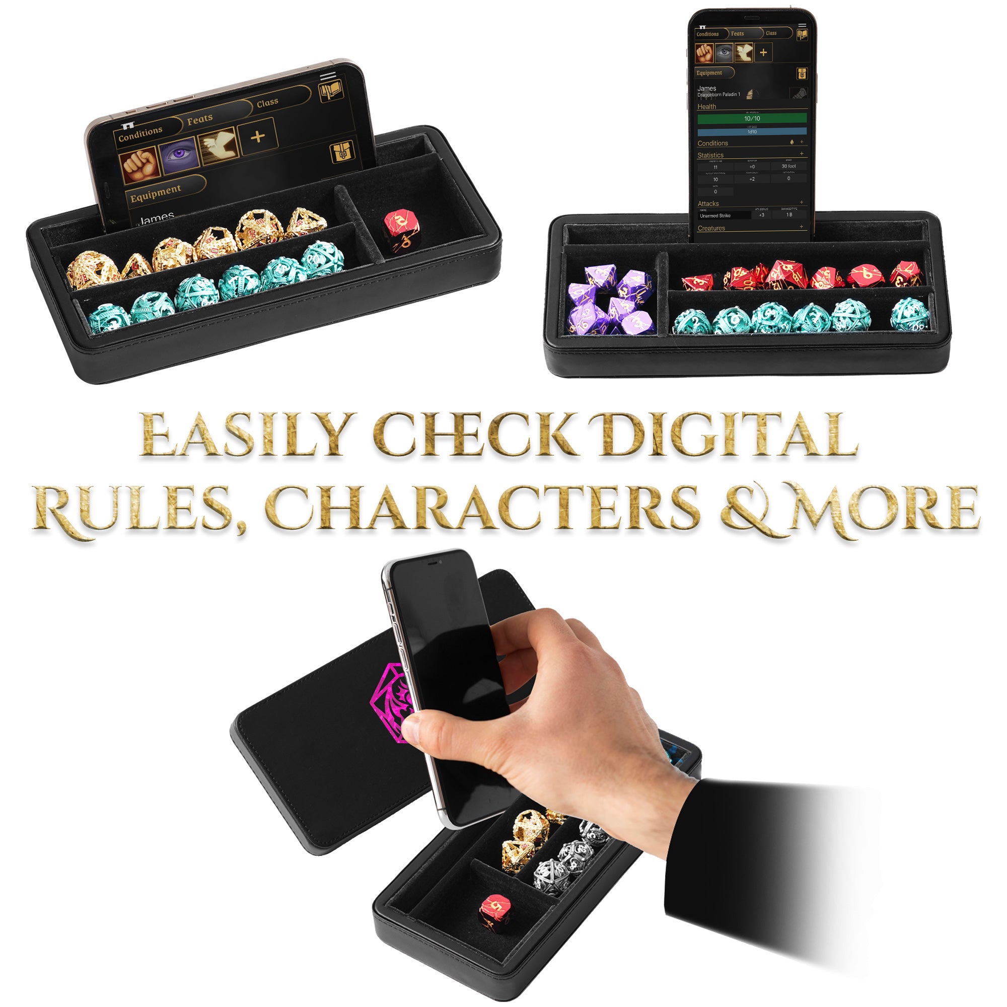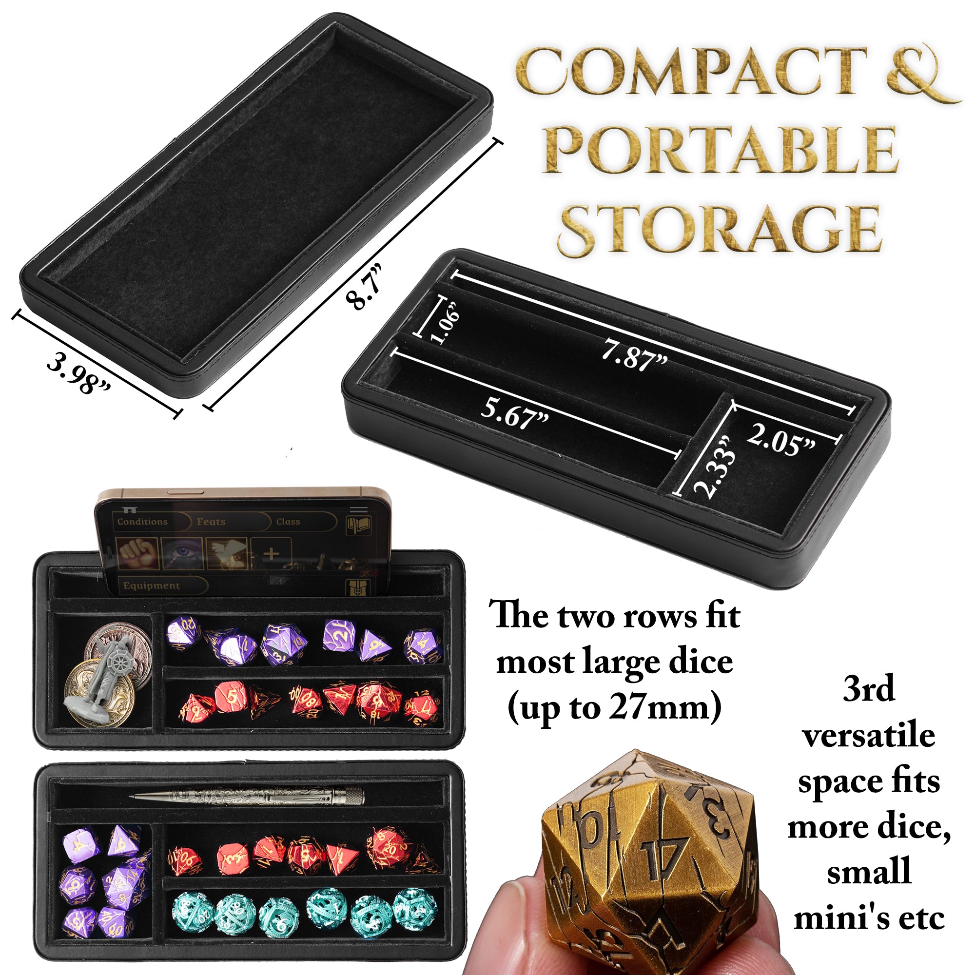 ✨ PLAY ANYWHERE, ANYTIME 3-in-1: The dice sanctum stores up to 3 dice sets; roll in our felt-lined tray; prop up your phone. Compact yet spacious enough for two rows of most metal and large dice (up to 26mm, not suitable for mini/micro dice), plus a versatile compartment for a regular set, miniatures, or other accessories for Dungeons and Dragons (*Accessories NOT included)