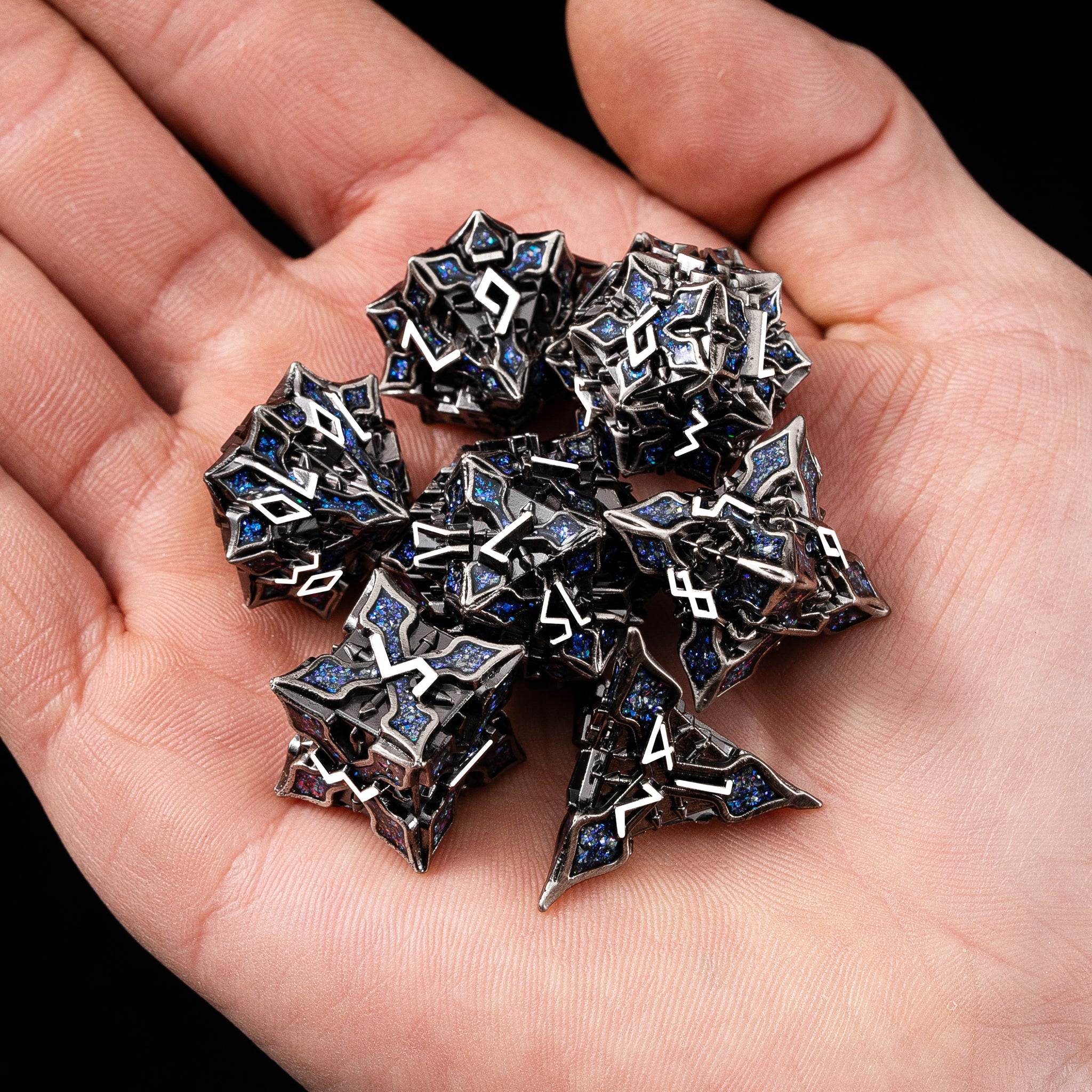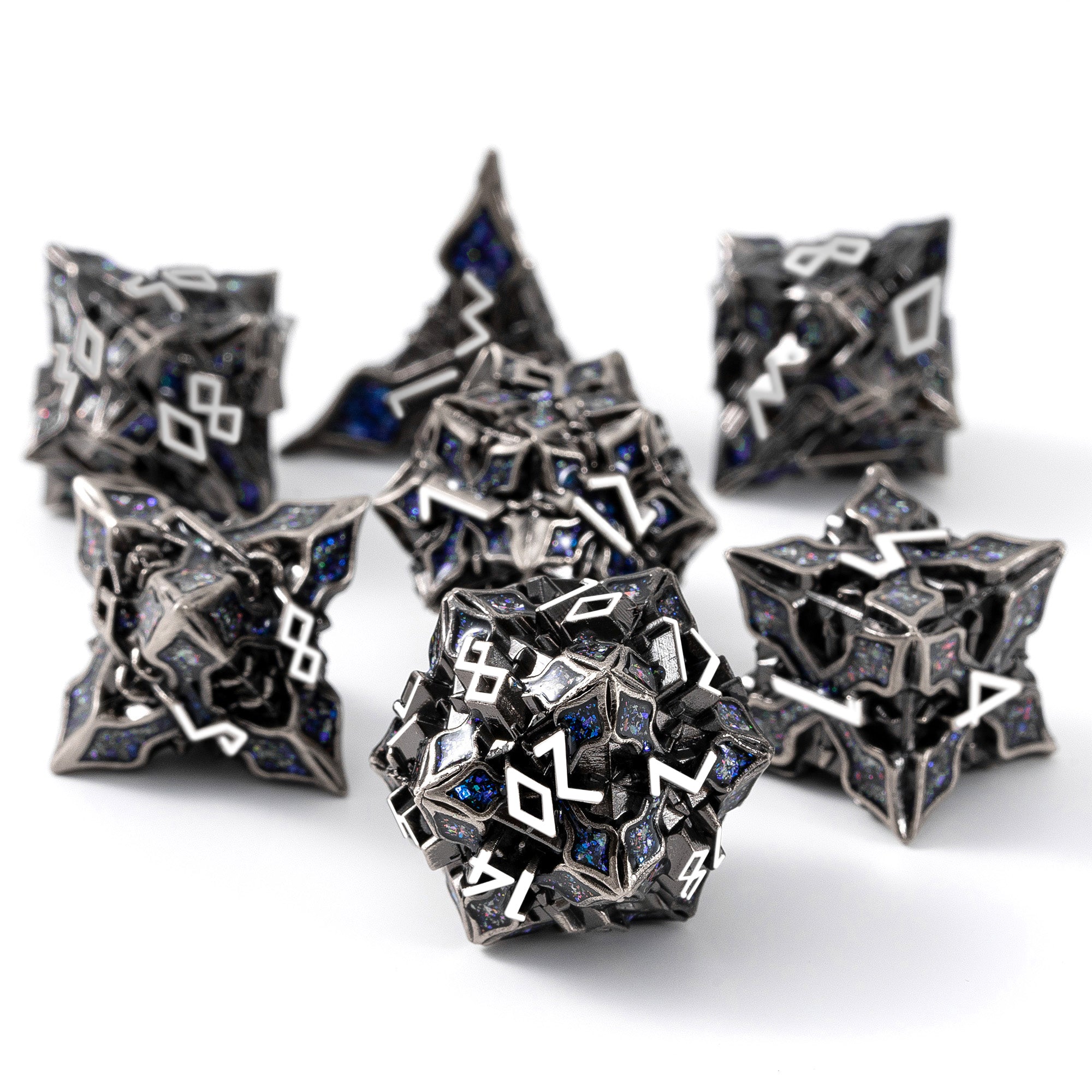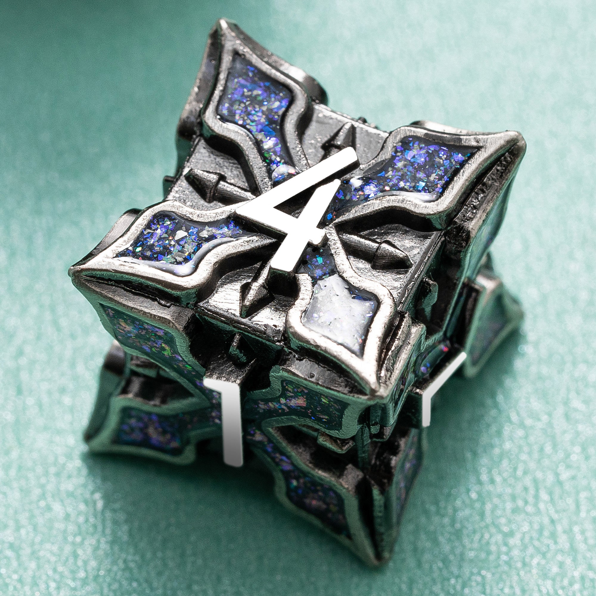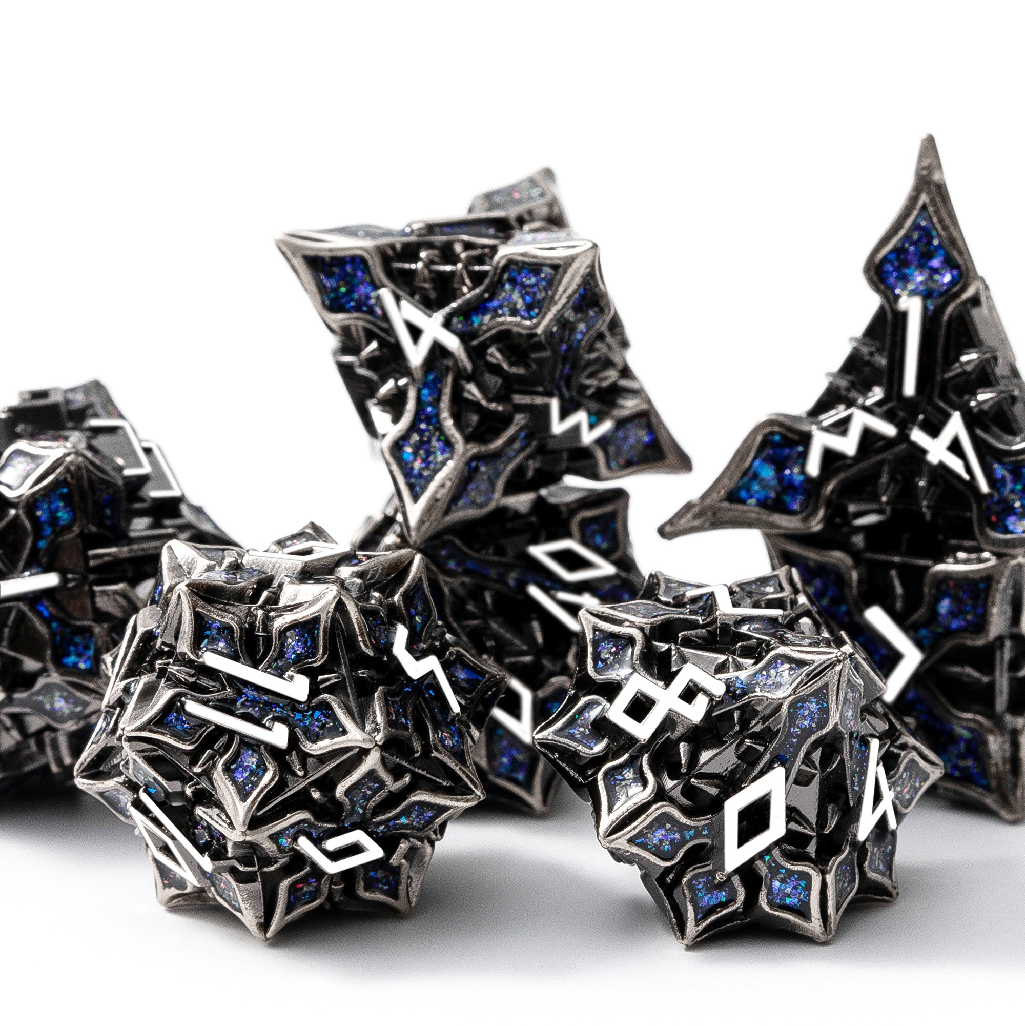 • Load image into Gallery viewer, Metal Dice for DND - Spire Sanctum Series - Beautiful Polyhedral 7 Piece Dice Set (Antique Silver Blue Glitter)
