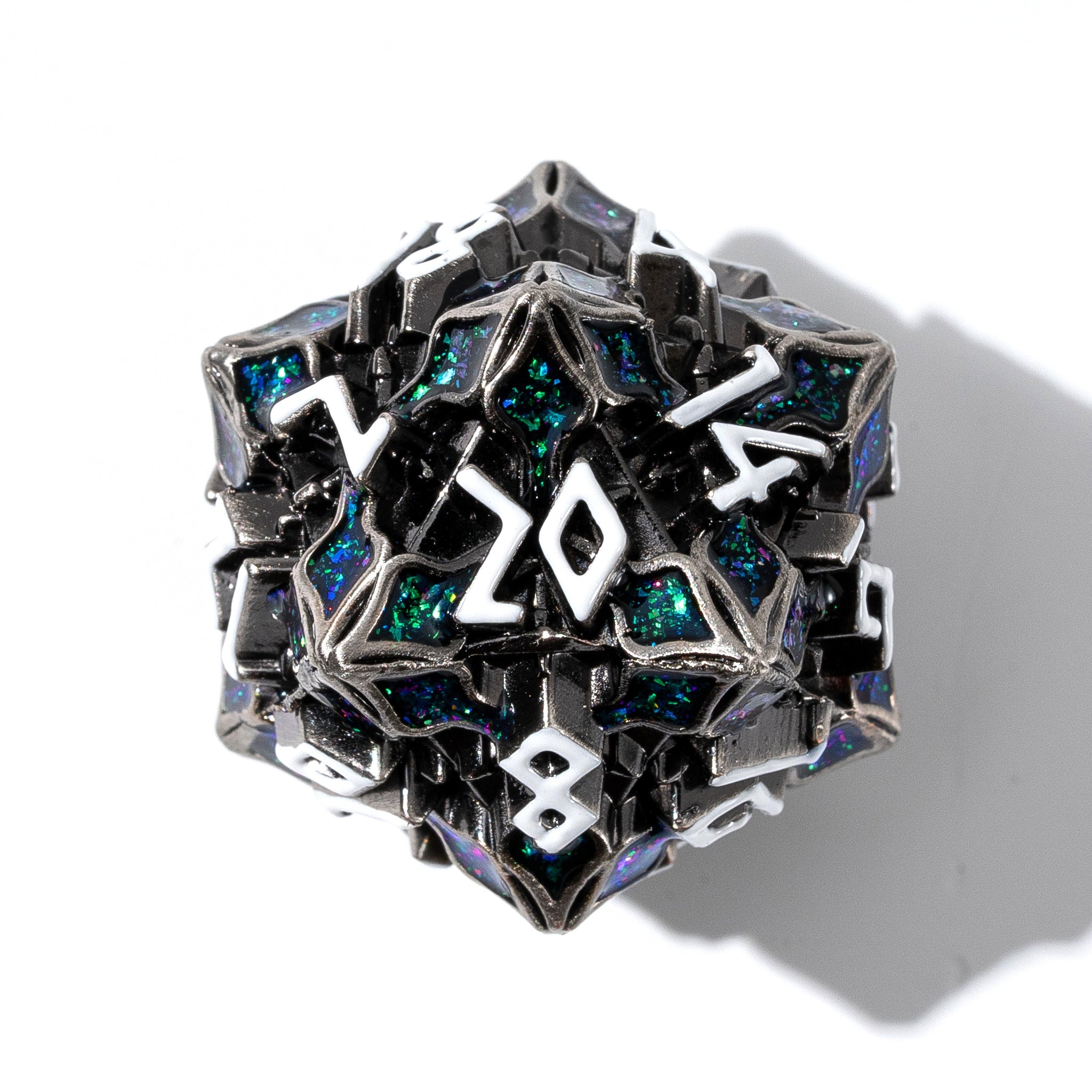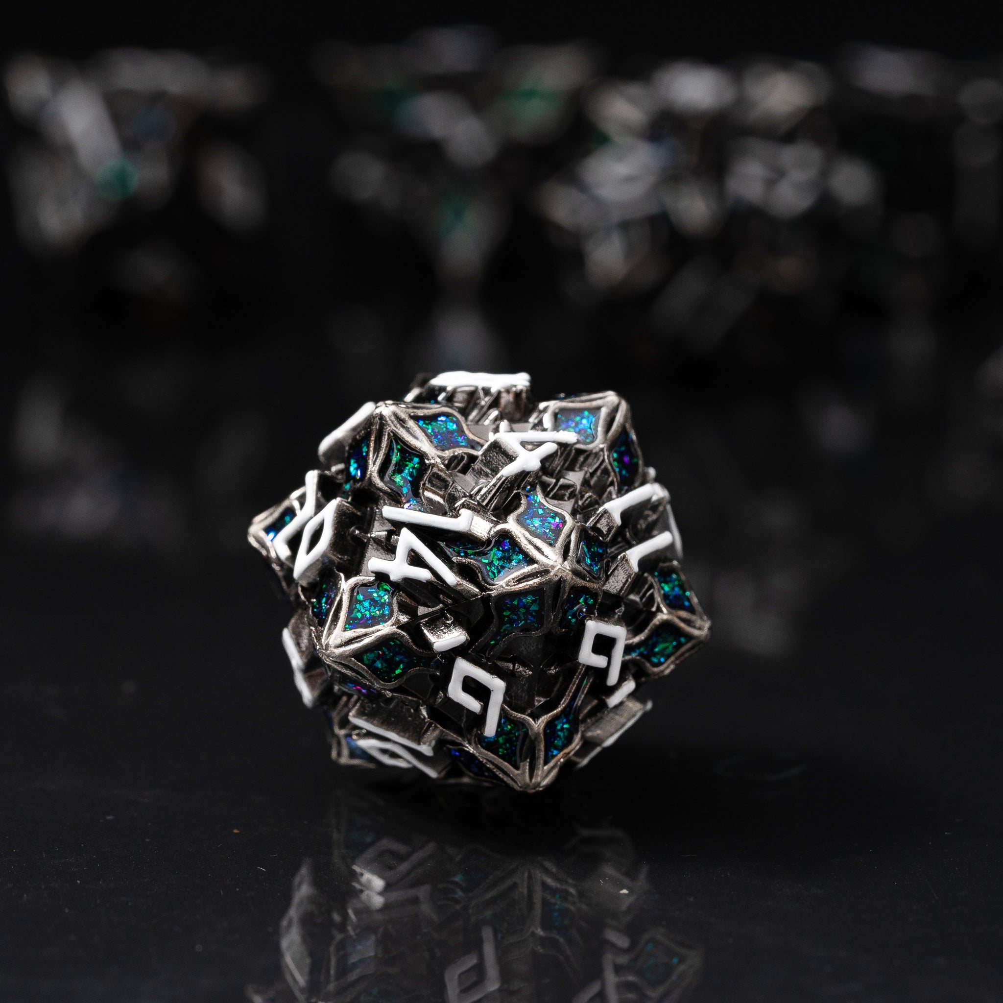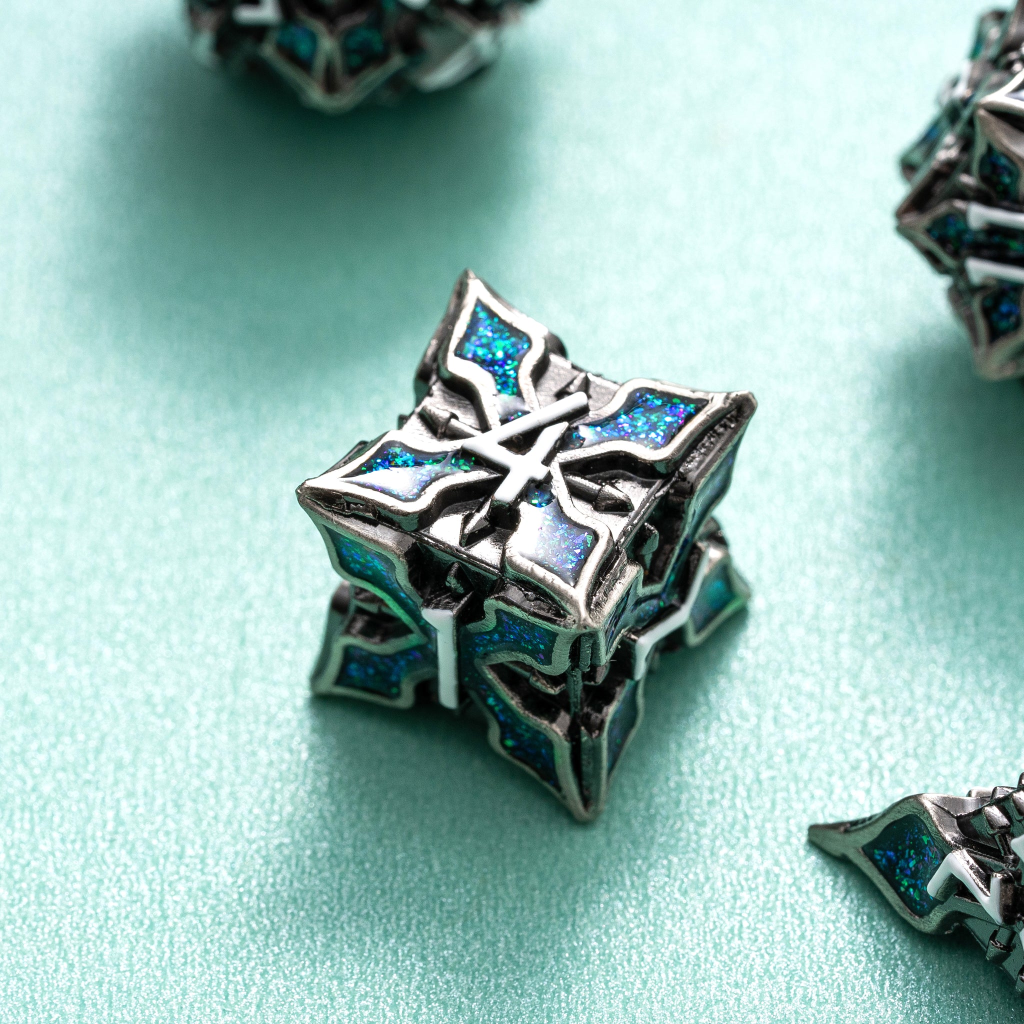 • Load image into Gallery viewer, Metal Dice for DND - Spire Sanctum Series - Beautiful Polyhedral 7 Piece Dice Set (Antique Silver Green Glitter)