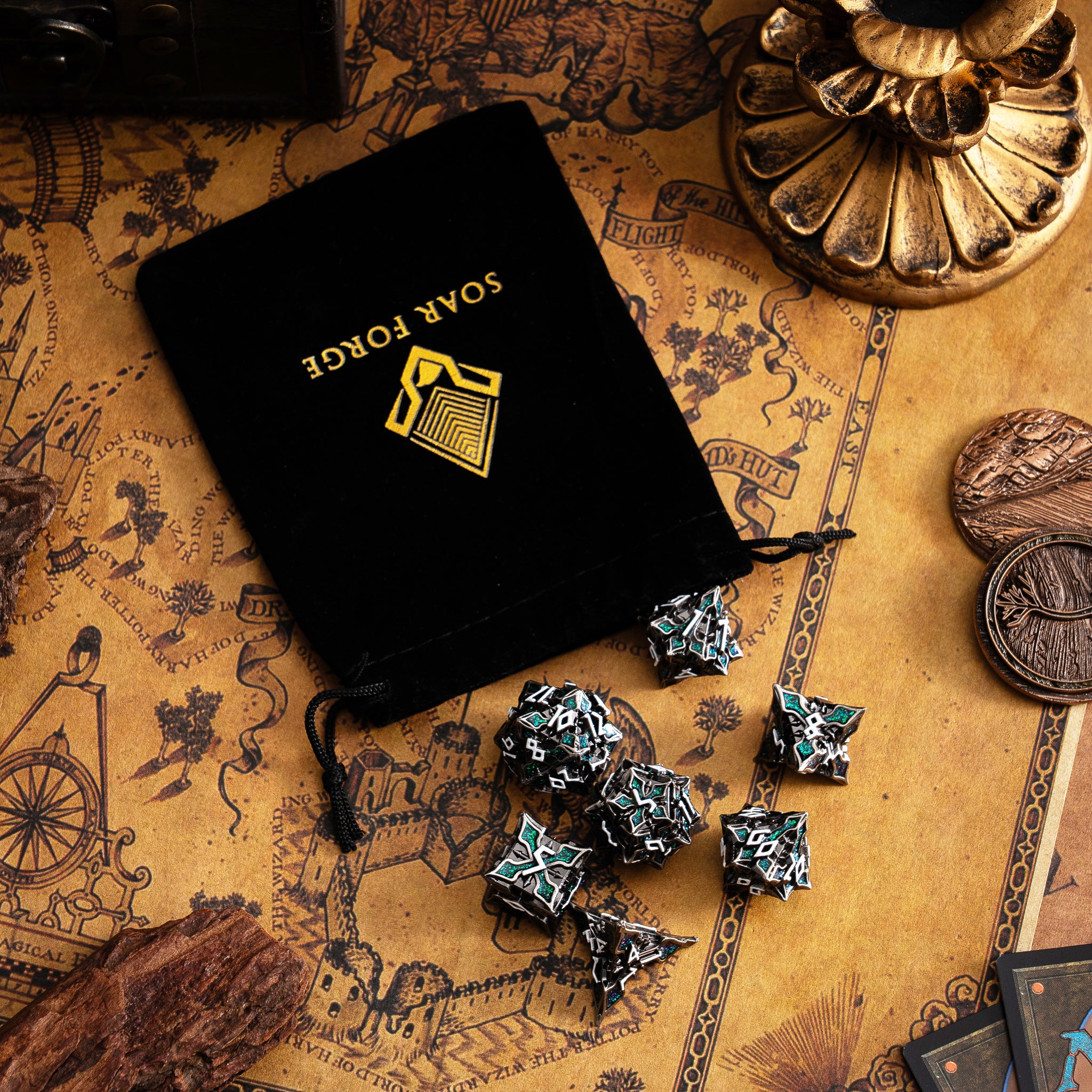Metal Dice for DND - Spire Sanctum Series - Beautiful Polyhedral 7 Piece Dice Set (Antique Silver Green Glitter)