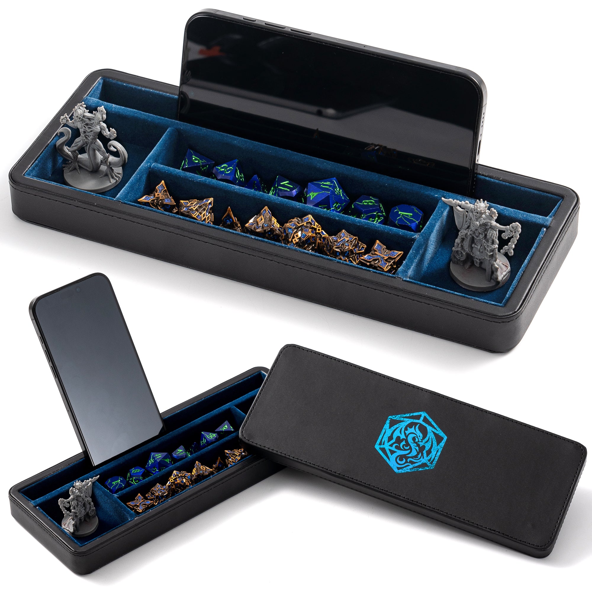 ✨ DRAGON-FORGED BRILLIANCE: Adorned with an intricate dragon and d20 design that shines beautifully in the light, adding immersive magic to your gaming table. The lid doubles as a dice tray, while the phone stand is perfect for referencing character sheets, rules, or other digital resources. *Phone stand slot Length: 9.92 inches (25.20cm), Width: 0.55 inches (1.4 cm). Fits most phones including those with standard cases - check width (0.55") for extra thick cases