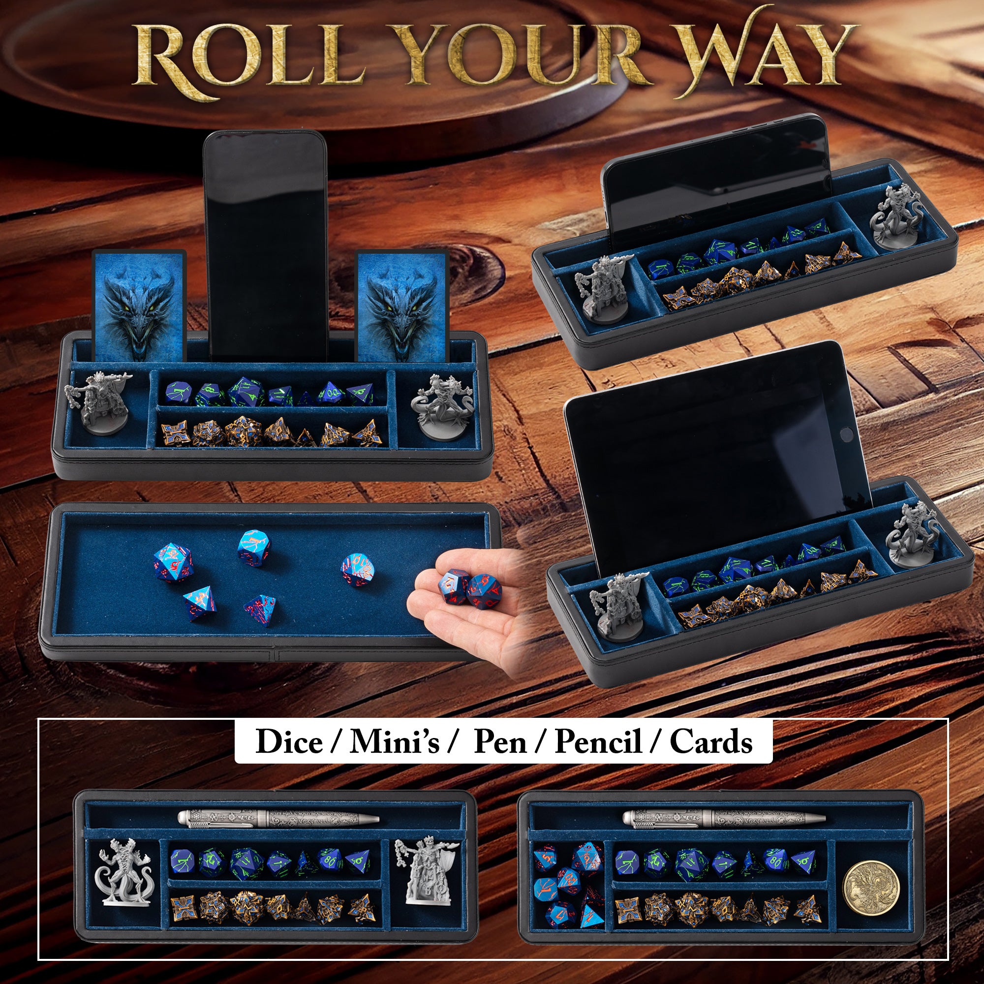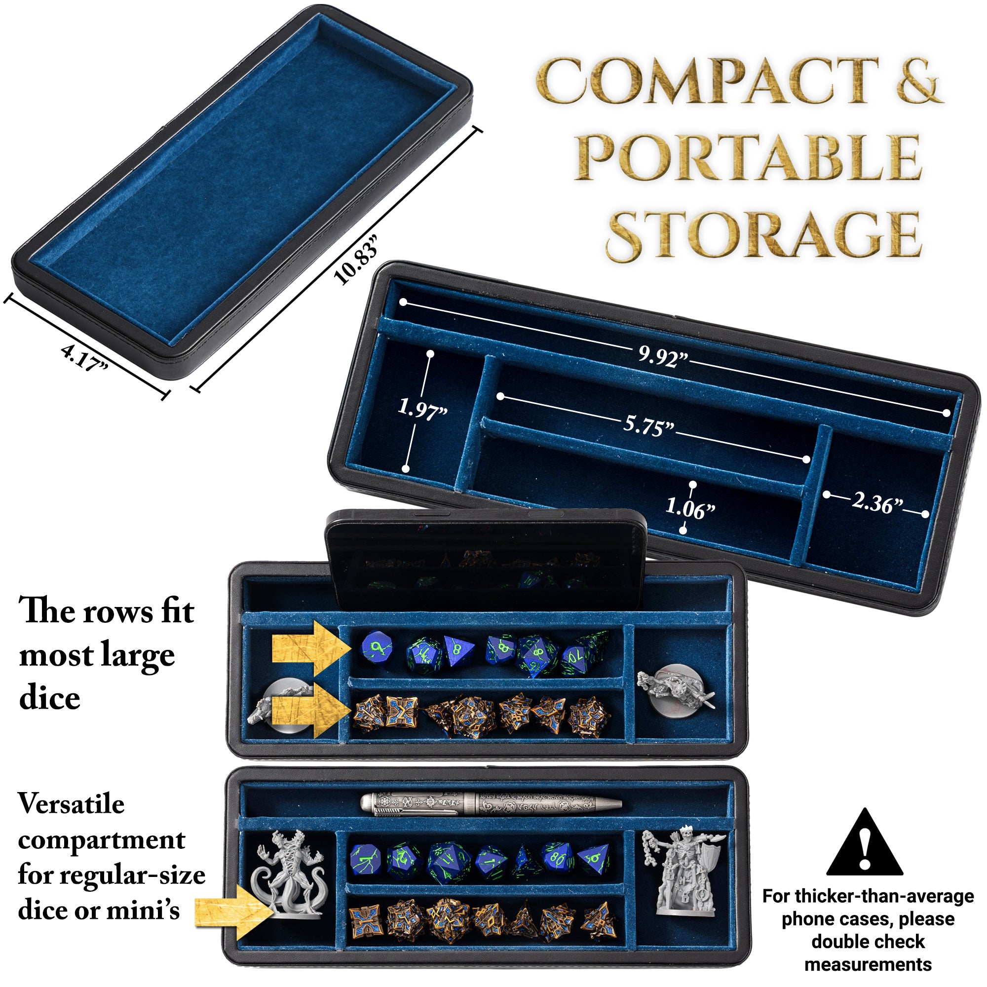 ✨ PLAY ANYWHERE, ANYTIME 3-IN-1: The dice sanctum stores up to 4 dice sets; roll in our felt-lined tray; prop up your phone. Compact yet spacious enough for two rows of most metal and large dice (up to 26mm, not suitable for mini/micro dice), plus a versatile compartment for a regular set, miniatures, or other accessories for Dungeons and Dragons (*Accessories NOT included)