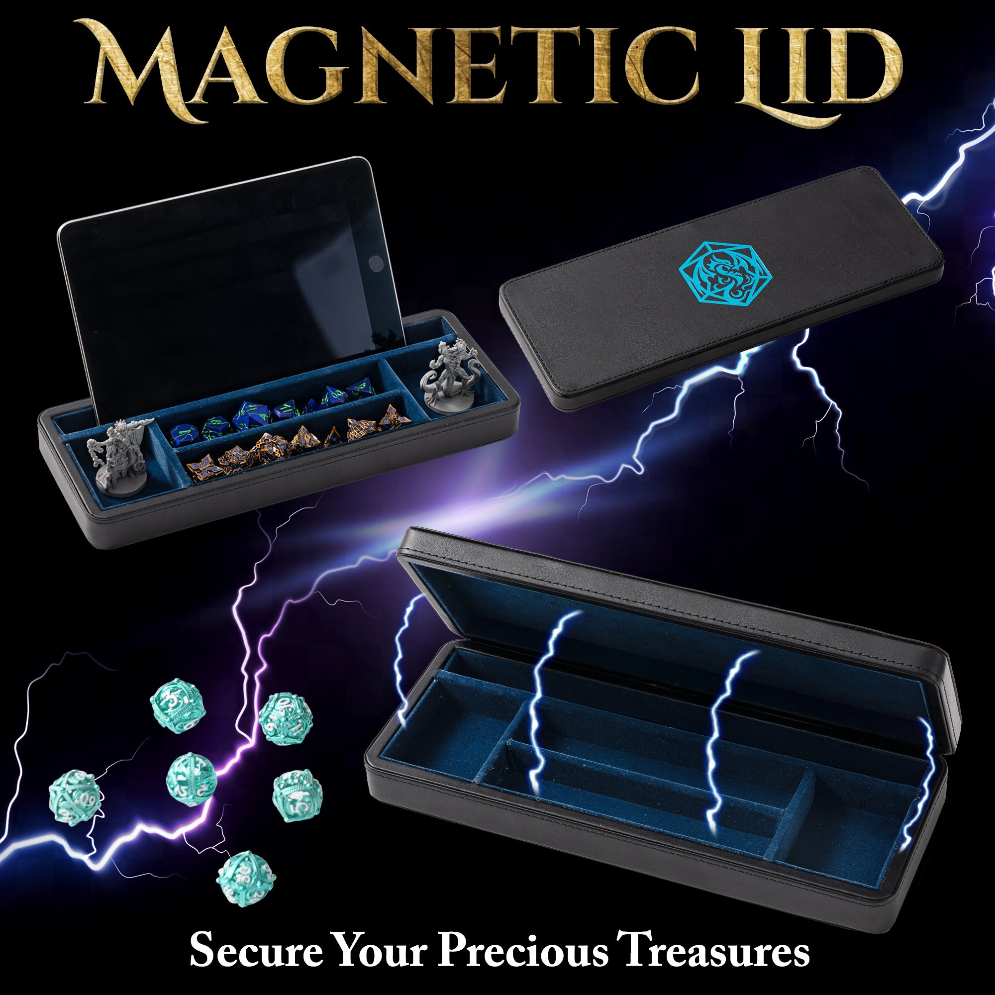 ✨MAGNETIC LID CLOSURE AND STORAGE: The secure lid keep your treasured dice and accessories safe whether you're battling dragons or commuting. This portable dice organizer offers flexibility—store prized metal dice sets or use extra space for gaming essentials like minis, coins, etc (dice and accessories not included)